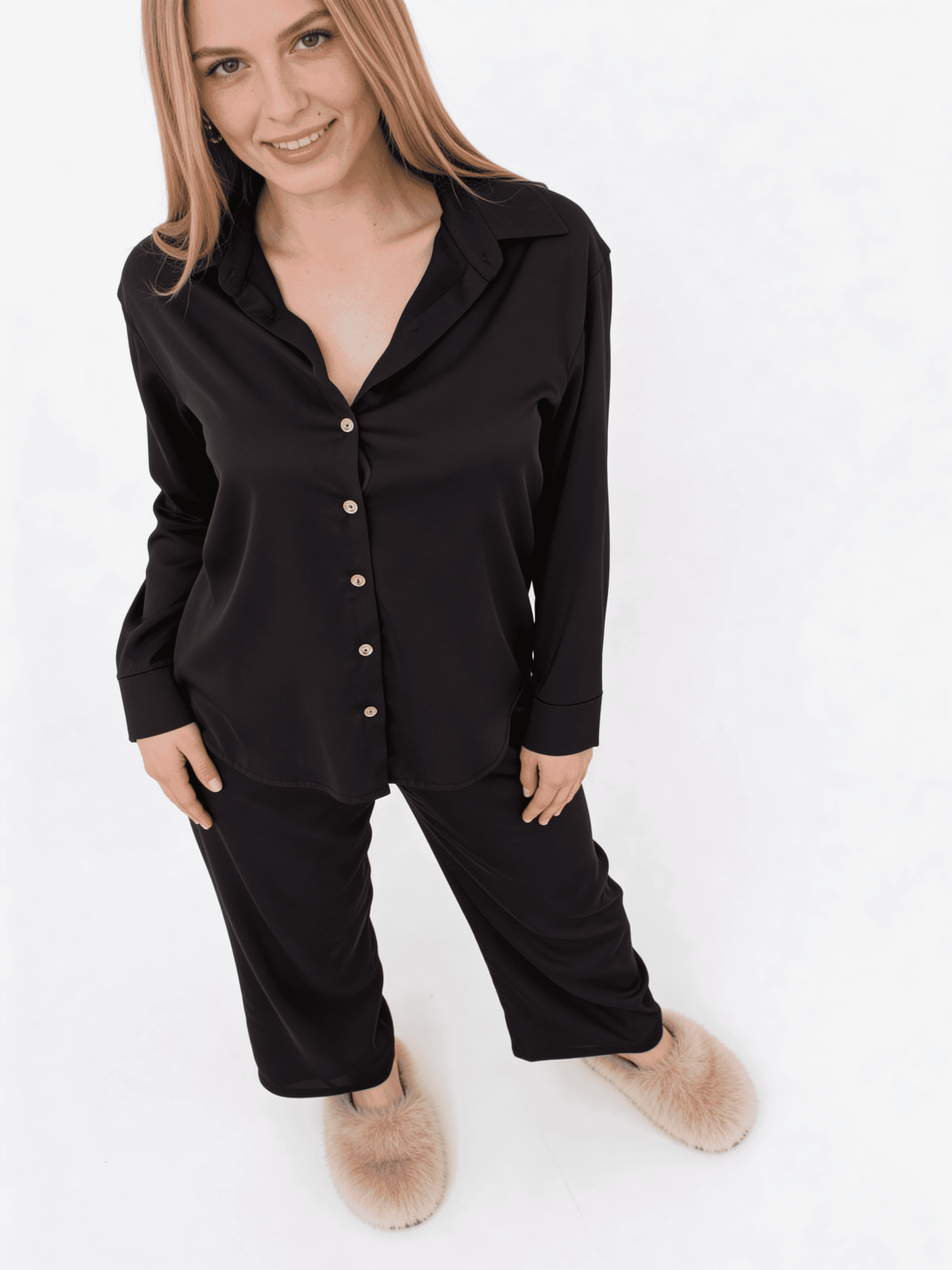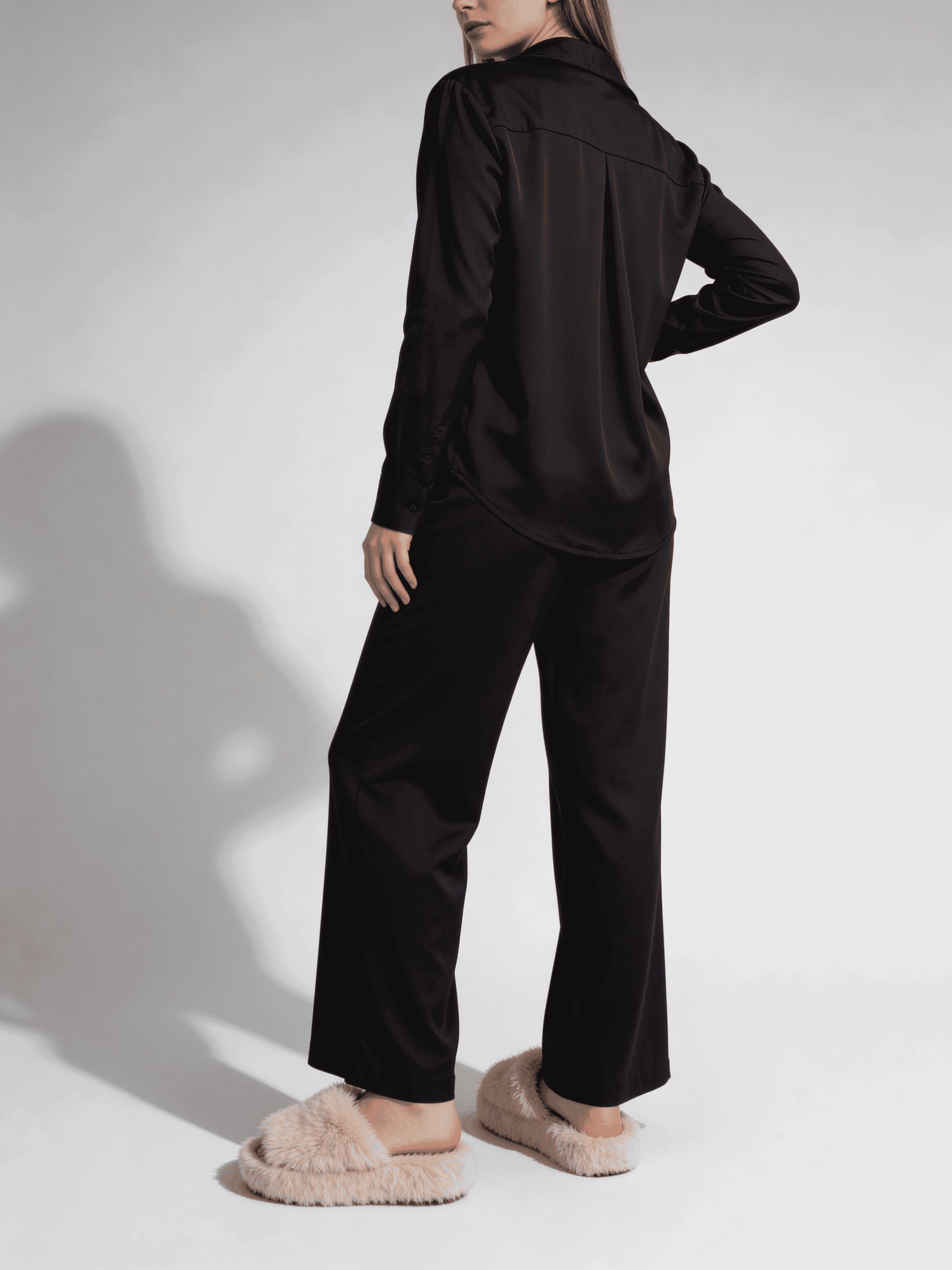 Damen-Set aus weicher Kunstseide. Das Oberteil ist eine elegante Bluse mit einem tiefen V-Ausschnitt und einem hübschen Stehkragen. Es wird mit verdeckten Knöpfen geschlossen, was dem Look Raffinesse verleiht. Die langen Ärmel sind mit klassischen Zwei-Knopf-Manschetten versehen. Die Hose hat einen geraden Schnitt und weite Beine. Das Modell wird durch einen weichen Gummibund ergänzt, der für einen bequemen Sitz sorgt. Das Set eignet sich sowohl für den Komfort zu Hause als auch für die stilvolle Freizeit - der leichte Glanz des Stoffes verleiht dem Look Raffinesse.