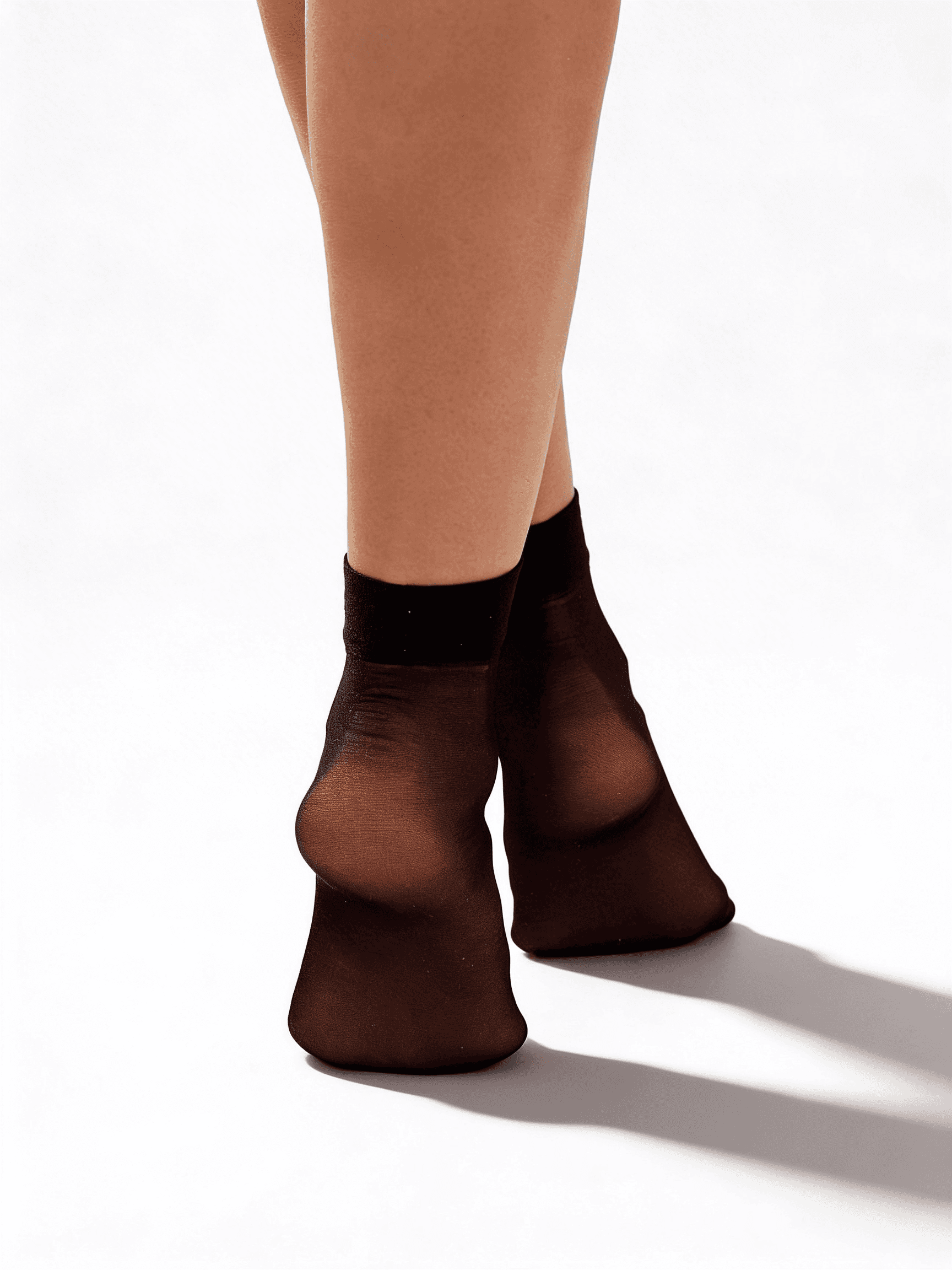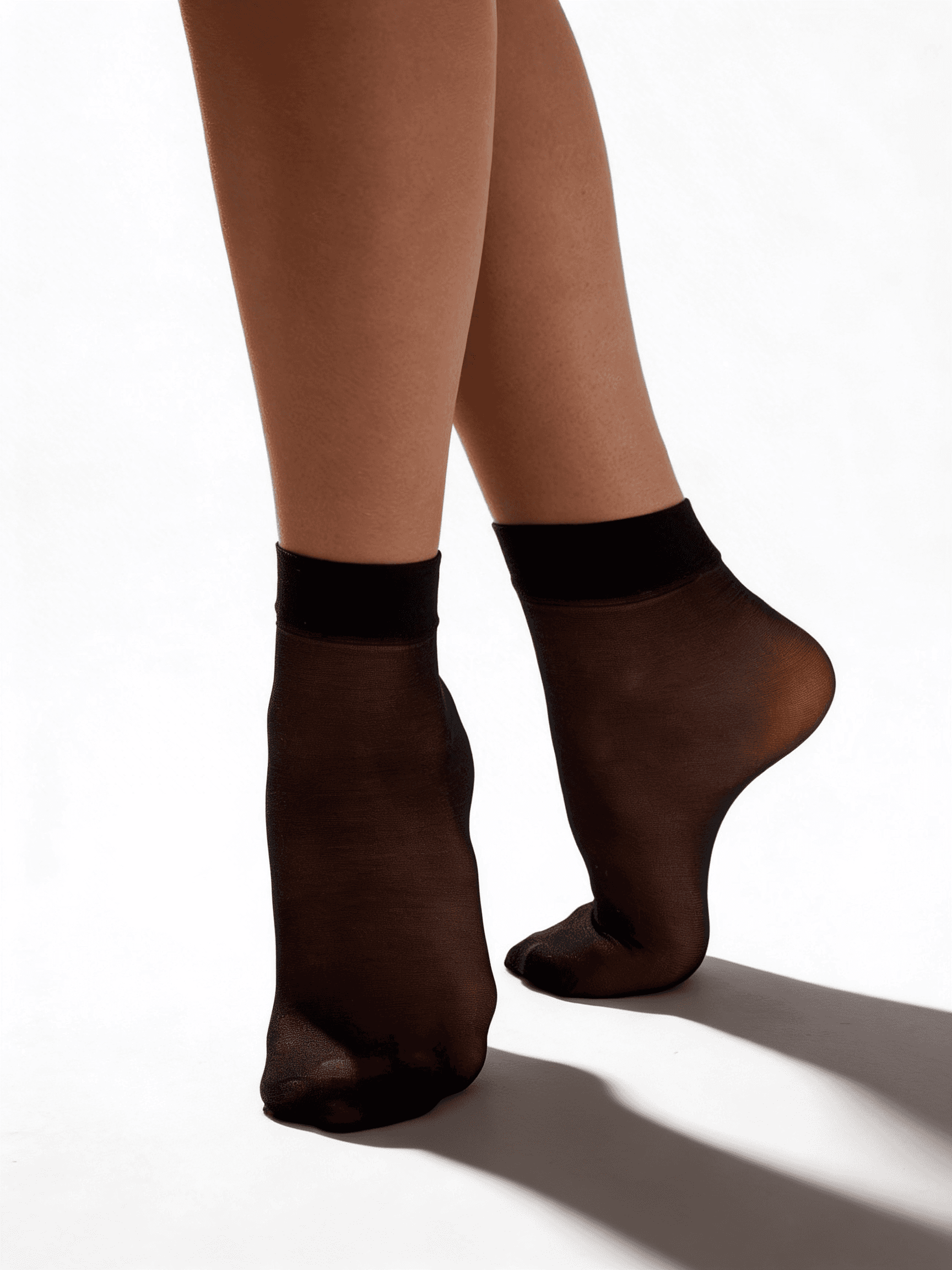 Transparente und dünne Damensocken mit mittlerer Höhe, gefertigt aus seidigem, mattem Polyamid mit einer Dichte von 15 den. Die zarten Socken sind am Fuß kaum spürbar. Für zusätzliche Praktikabilität verfügen sie über verstärkte Spitzen und einen breiten, komfortablen Bund, der den Fuß nicht einschnürt.