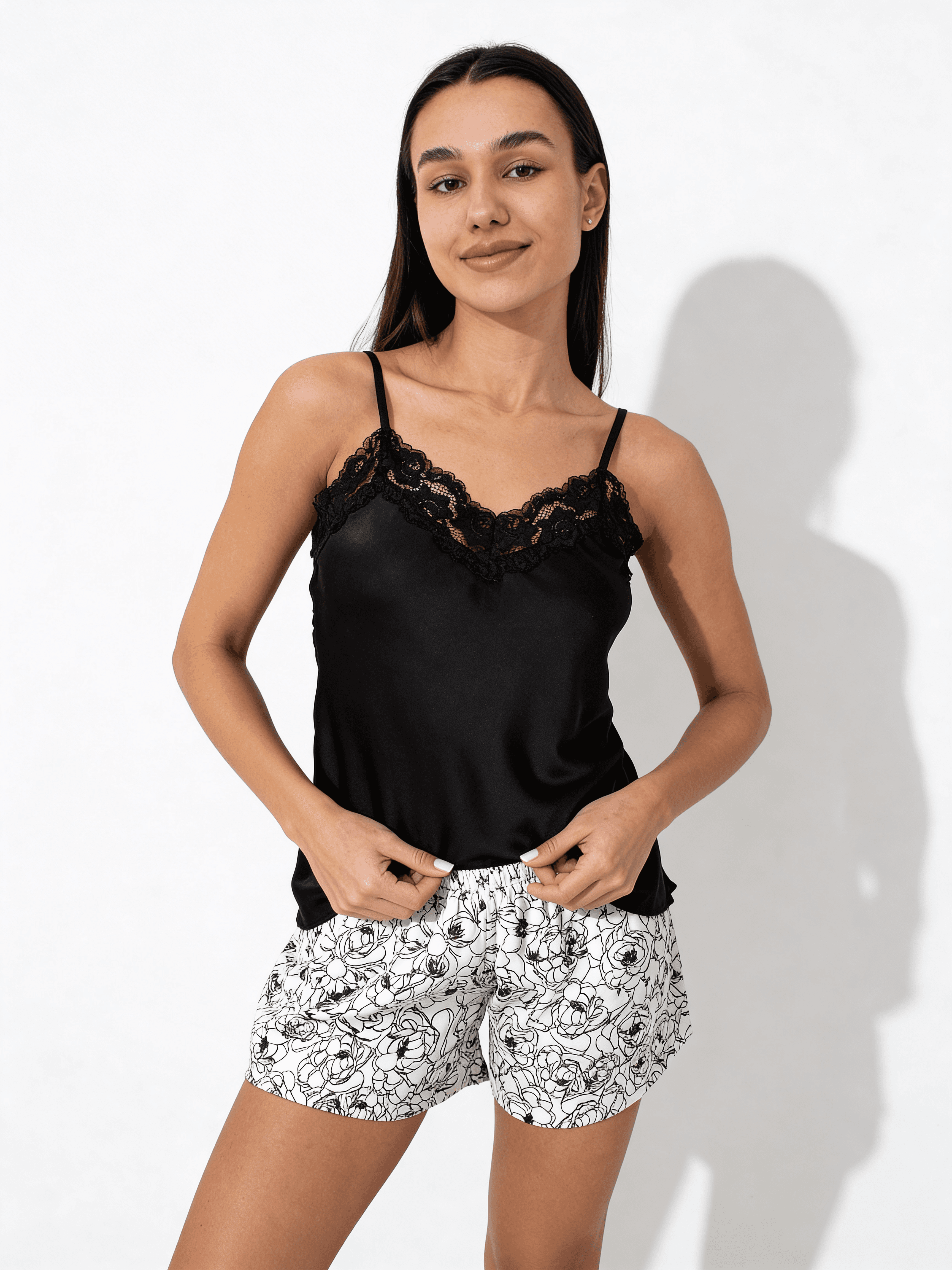 Lassen Sie den Tag hinter sich und genießen Sie echten Luxus in einem Seidenpyjama. Das schwarze Top mit feiner Spitze und verstellbaren Trägern betont elegant die Silhouette, während die weißen Shorts mit Pfingstrosen-Print Leichtigkeit und Romantik verleihen. Ein Seidenset für besondere Wohlfühlmomente zu Hause.