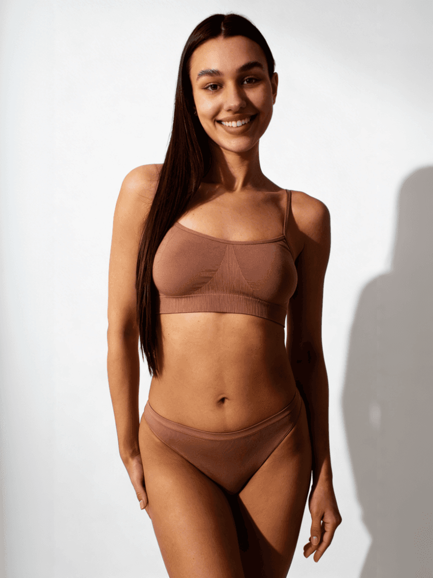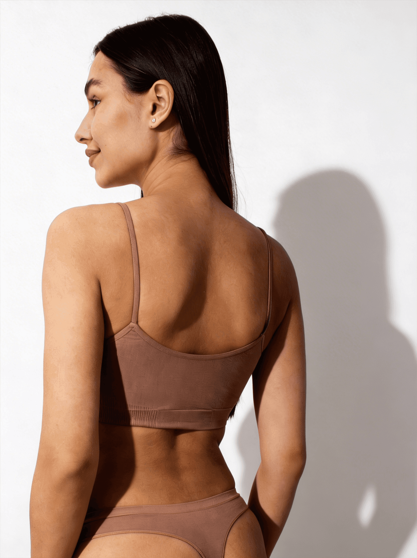Nahtloses Top mit dünnen Trägern aus weicher und atmungsaktiver Mikrofaser. Die Träger des Tops sind eingenäht, elastisch, nicht dehnbar und nicht in der Lange verstellbar. Das Oberteil hat keine Nahte, ist gut für den Sport geeignet und kann mit Leggings in der gleichen Farbe kombiniert werden.