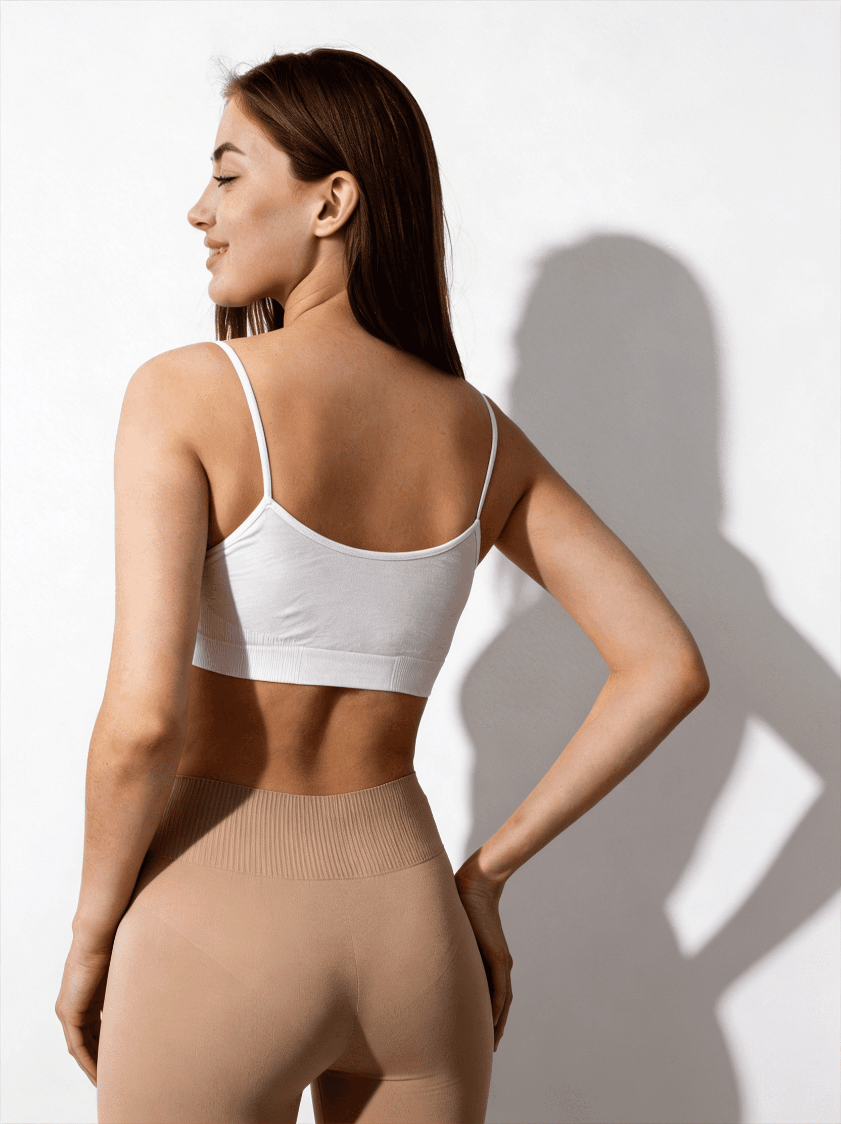 Nahtloses Top mit dünnen Trägern aus weicher und atmungsaktiver Mikrofaser. Die Träger des Tops sind eingenäht, elastisch, nicht dehnbar und nicht in der Lange verstellbar. Das Oberteil hat keine Nahte, ist gut für den Sport geeignet und kann mit Leggings in der gleichen Farbe kombiniert werden.