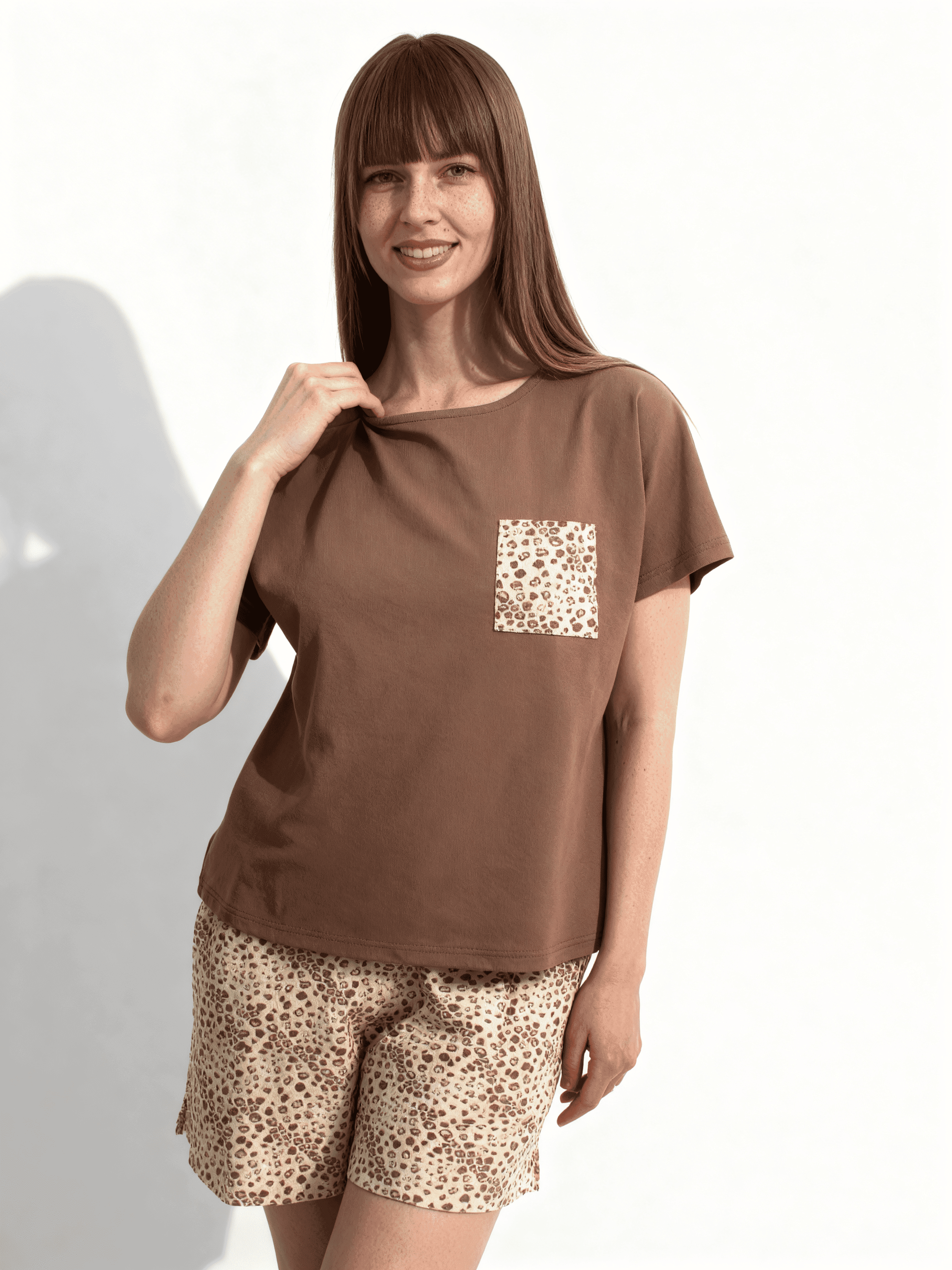 Bequemes Nachtwäsche-Set aus Baumwolle. Locker geschnittenes T-Shirt mit überschnittenen Ärmeln und Rundhalsausschnitt. Eine aufgesetzte Tasche in Kontrastfarbe auf der Brust ist ein modischer Akzent. Die Shorts sind mit Seitentaschen und kleinen Schlitzen an den Seiten ausgestattet, die für Bewegungsfreiheit sorgen. Der Bund der Shorts ist mit einem bequemen 3 cm breiten Gummiband gesichert. Die perfekte Wahl für gemütliche Entspannung zu Hause zu jeder Zeit des Jahres.