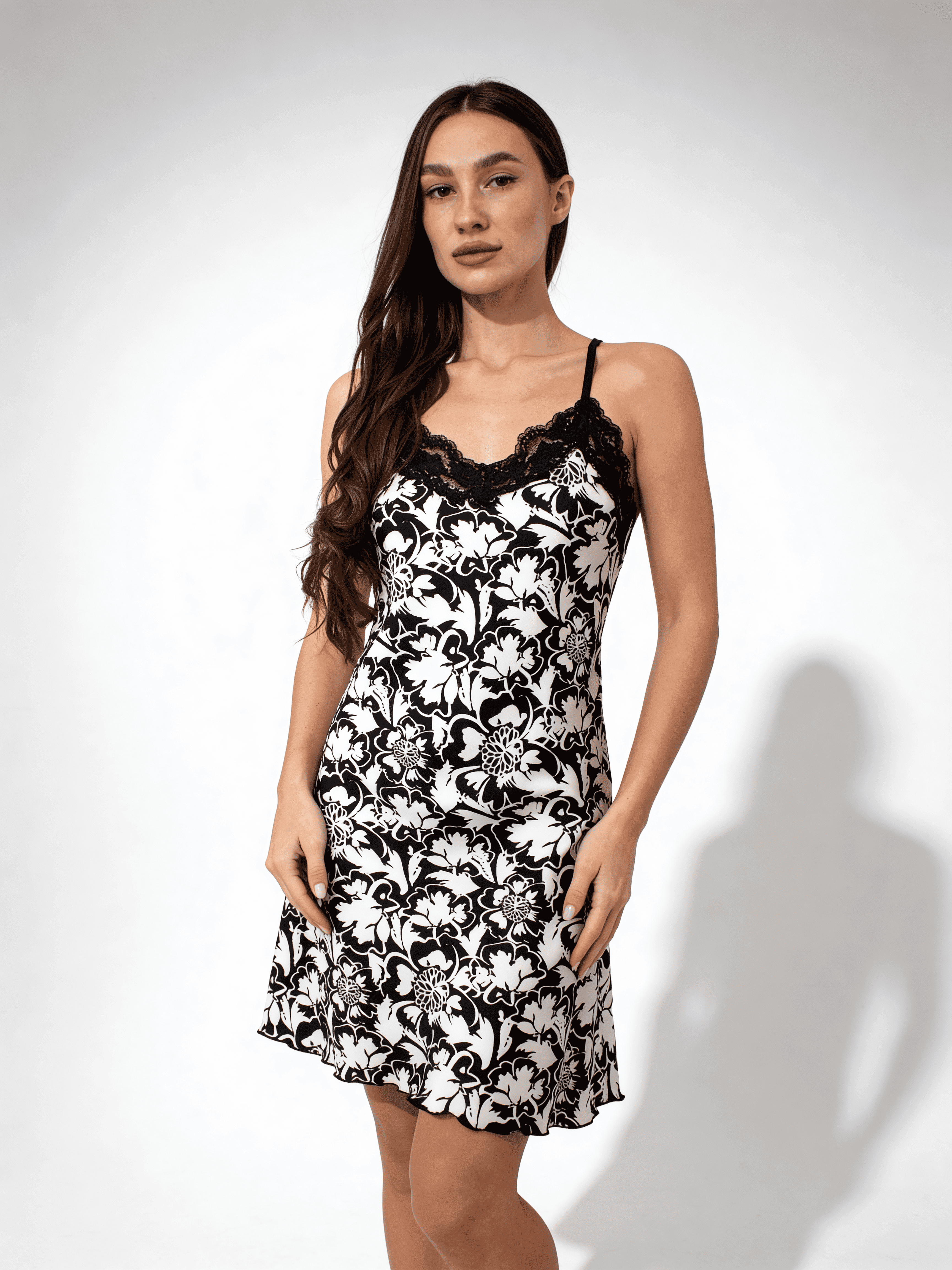 Das Nachthemd mit dünnen verstellbaren Trägern ist eine Kombination aus Leichtigkeit, Eleganz und Komfort. Es ist aus weicher Kunstseide gefertigt, die sich sanft an den Körper anschmiegt und ein Gefühl von Luxus vermittelt. Besonderes Augenmerk liegt auf der exquisiten Spitze, die den Ausschnitt ziert und ein Bild von Raffinesse und Weiblichkeit vermittelt. Das florale Muster auf dem Stoff schafft eine zarte, romantische Stimmung und macht dieses Hemd zu einer idealen Wahl für ruhige Abende und einen angenehmen Schlaf.