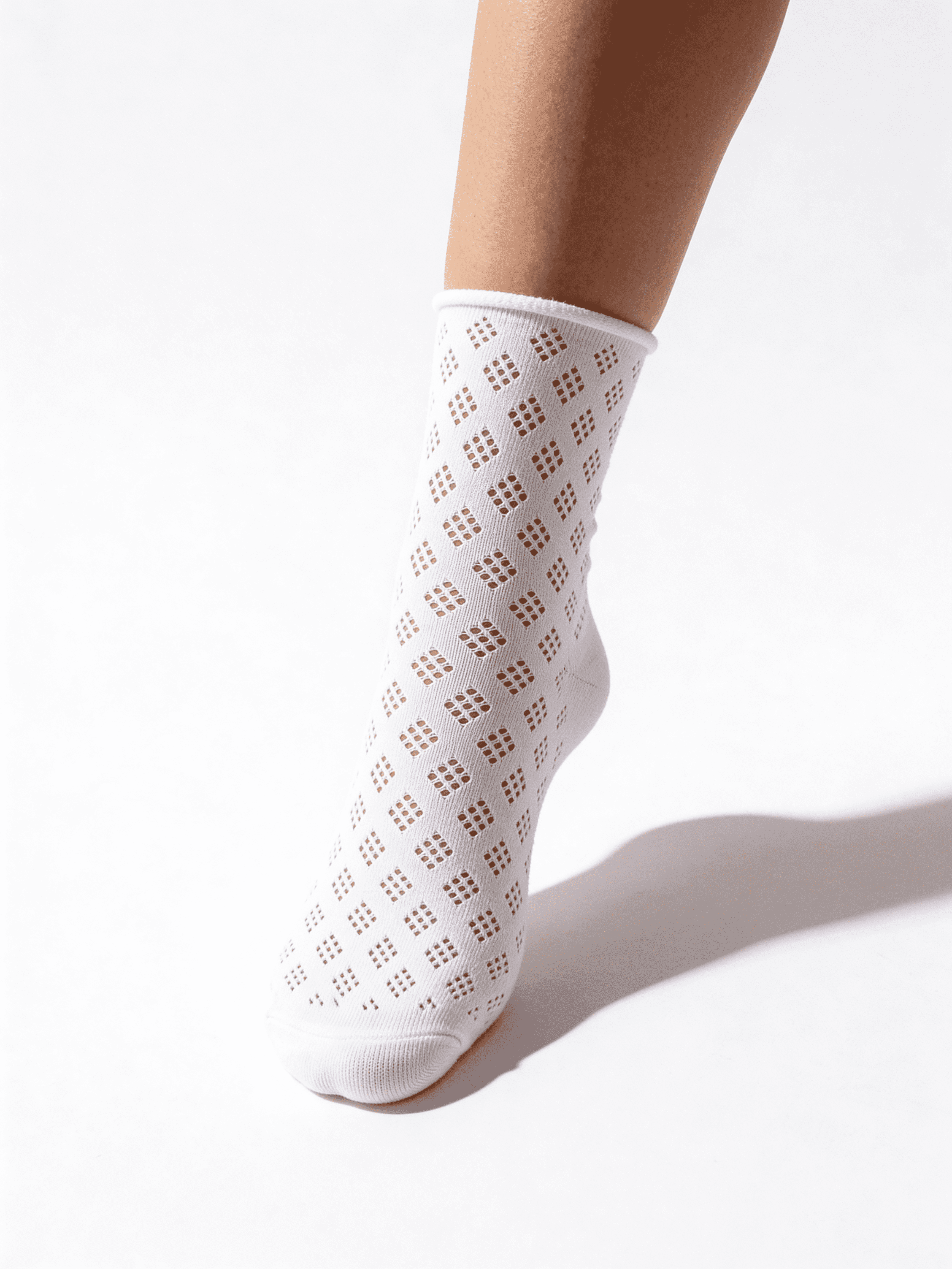 Damensocken mit Lochmuster ohne Rand - weich und bequem. Hergestellt aus Baumwolle mit Polyamid und Elastan für Haltbarkeit und Elastizität. Hohe Passform - für einen sicheren Sitz ohne Verrutschen. Kein Gummiband - keine Abdrücke oder Druck auf der Haut. Das Produkt hat einen verstärkten Zehenbereich und eine geformte Ferse.