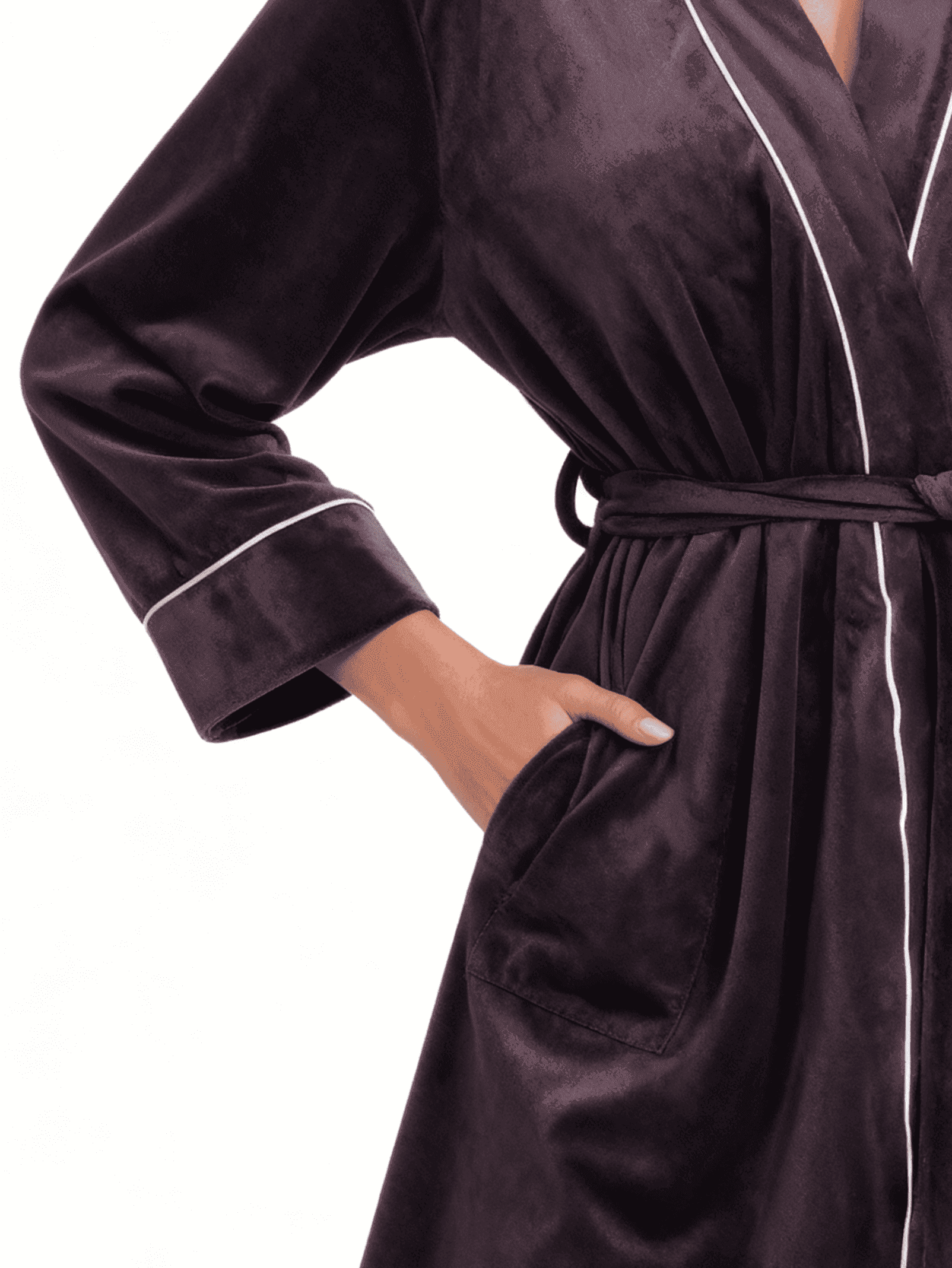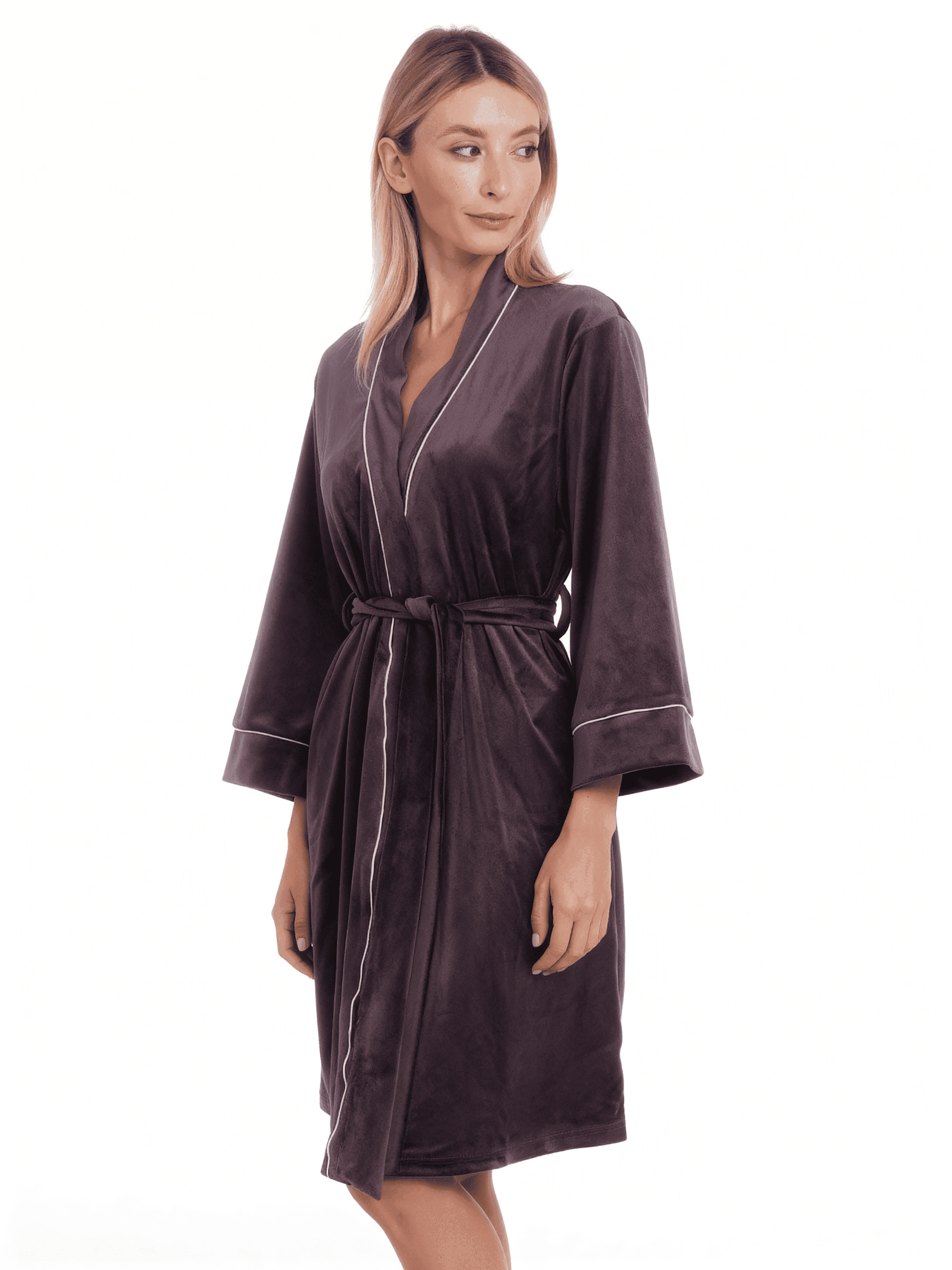 Ein weicher Velourbademantel ist zweifellos die beste Wahl für die kühle Jahreszeit. Er schenkt Wärme und Geborgenheit, während der edle, samtige Stoff auf der Haut wunderschön aussieht und Ihrem Look eine besondere Eleganz verleiht. Der Velourmantel mit Bindegürtel passt sich perfekt der Figur an und schränkt die Bewegungsfreiheit überhaupt nicht ein. Die mittlere Länge bis zum Knie sorgt für zusätzlichen Tragekomfort. Ein solcher Bademantel ist ideal für Frauen, die auch zu Hause stilvoll und elegant aussehen möchten – und das Beste: Er ist unglaublich bequem!